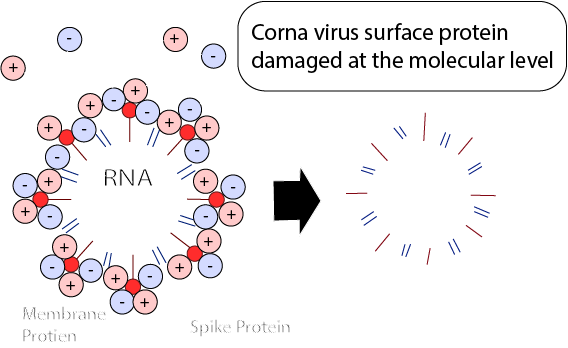 Positive ions (H*) and negative ions (O2-) cluster around the spike protein (a surface protein that attaches to an organist and triggers the infection) of the airborne virus, and are converted to hydroxyl radicals (*OH), a powerfully active substance. By stealing H (hydrogen) from within the spike protein, the ions react and combine chemically to form water (h2O). Because the spike protein is damaged, the virus cannot infect cells even when introduced into the body.